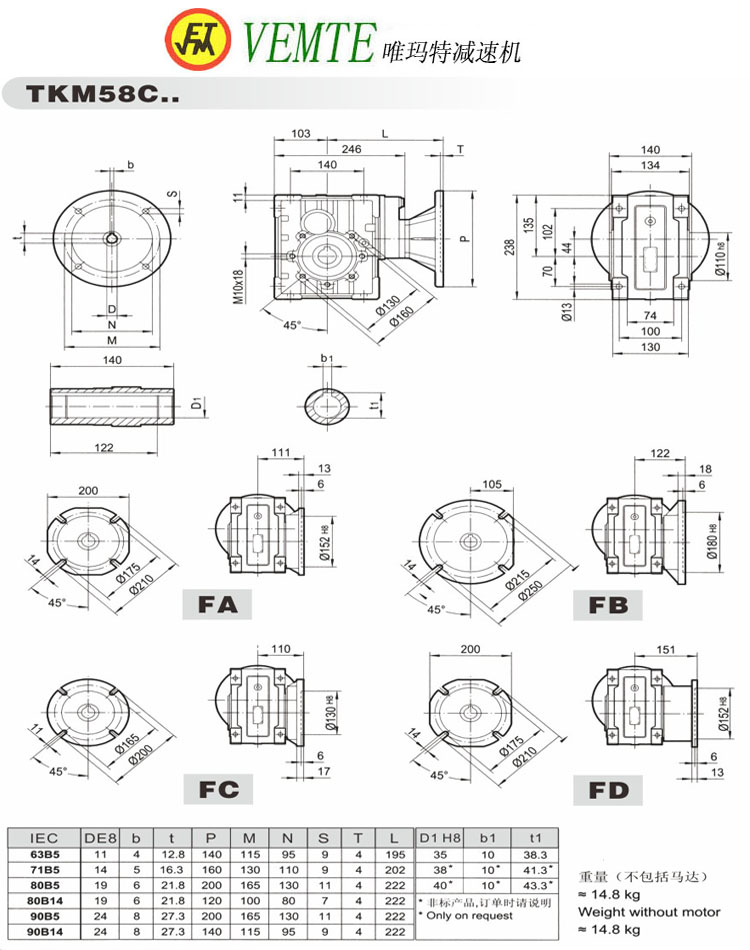 7.BKM090系列減速器安裝尺寸與TNRV系列蝸輪蝸桿減速器完全兼容(TKM28與TNRV050部分尺寸不同);